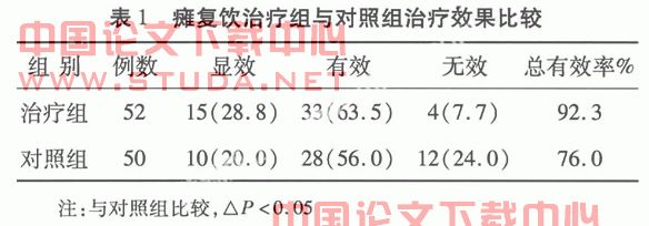 2.1 瘫复饮治疗组与对照组治疗效果比较,见表1。