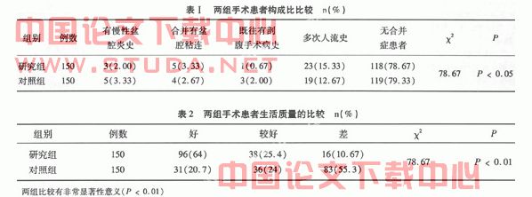 1.2 方法 研究组为经患者同意实行改良式筋膜内子宫切除术后患者150例,对照组为同等病种、同等年龄组行经腹经典子宫切除术患者150例。两组患者均按常规手术操作,出院后有专门工作人员进行随访调查,并对对照组人员进行严格筛选、登记,对观察项目进行详细记录,按时进行统计分析。
