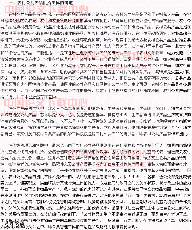 (2)供给责任不清,供给主体错位。公共产品自身的特性,决定了政府必然是农村公共产品的重要供给主体。但在实际中,中央与地方在农村公共产品的供给责任划分上不尽合理,造成了农村公共产品供给主体的错位。1有关政府在供给农村公共产品上的缺位。与城市公共产品相比,农村公共产品的明显特征是纯公共产品少,准公共产品多,并且界限相对模糊,加之农村地域的分散和环境的差异,其生产带有分散性,因而政府提供与否的收缩性较大。在我国,当涉及两级或多级政府间的共同事务时,中央政府、各省、市、县及乡政府在公共产品供给责任的确认、调整机制及分担标准等方面,缺乏一个明确有效的分担机制,随意性较大。例如,基础、基本医疗、计划生育都是国家的基本国策,具有很强的溢出效应,属于全国性公共产品,应当由中央政府提供和融资,但实际上这些供给责任推给了县乡政府以及村委会来负责。2乡镇政府在供给过程中的错位。一方面,由于上级政府的缺位,乡政府承担着与其财力极不相称的职能,支出负担沉重;另一方面,由于乡政府职能过宽,机构设置过多,生产性支出处于萎靡状态,影响了农村公共产品的供给。3村民自治组织——村民委员会在供给过程中的困境。村委会是农村社区内的公共物品的组织者,但在乡镇政府与村委会关系没有理顺的情况下,乡镇政府经常利用政治权威将属于政府职责范围内的公共产品的供给责任推卸给村委会,从而影响到村级公共产品的有效供给。