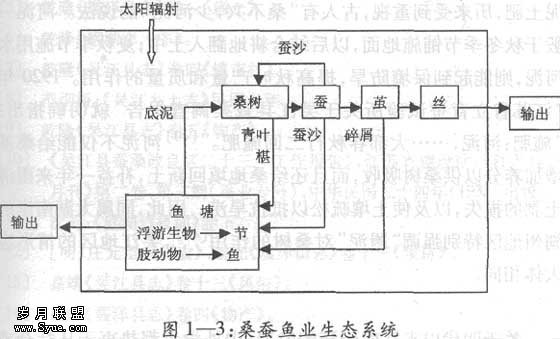 最后,从生物环境分析。吴江位于太湖之滨,湖荡星罗棋布,水面辽阔,尤其是濒临太湖的西南地区湖荡密布,西部和南岸分别以长漾和麻漾两大湖荡为中心分布有众多的大小湖荡,頔塘、麻溪和烂溪等主要河道也集中于此。并且,自唐中叶吴江塘岸筑成,其岸西便随着淤滩的逐渐涨出而成许多溇港。至明代,自北往南在太湖与吴江运河北段和頔塘之间分布有许多纵向的小渠,称为“溇”或“港”,南岸的溇港尤其密集,其相距仅一二里,北起大浦港,西南至胡溇有72条直通太湖的河道,即所谓“震泽七十二溇港”。西南地区辽阔的水域面积,为湖荡和水道养鱼提供了十分良好的环境。唐代内塘养鱼兴起,主要养殖品种有青、草、鲢、鳙、鲤。明代对青、草、鲢、鳙四大家鱼已有较完整的饲养方法,而种桑和养鱼却构成了一个十分良好的生物生态结构,称之为桑基鱼塘系统。食物链是生态系统的基本结构,通过初级生产、次级生产、加工、分解等完成代谢过程,完成物质在生态系统中的循环。桑基鱼塘构成了比较典型的水陆交换生产系统(见图1—3),明代以来吴江西南地区桑树的广泛种植,基本形成了这种多目标的生产体系。