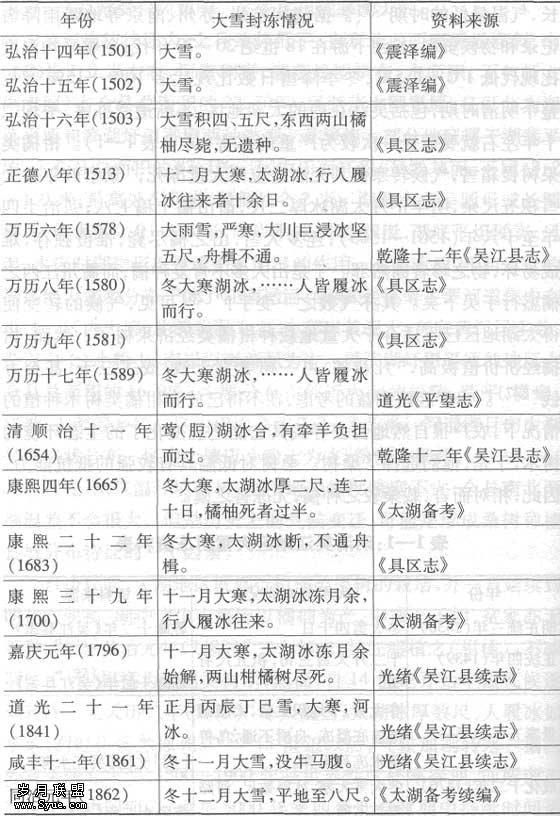 自唐代起,太湖地区就盛行柑橘类果树的栽培,并一直延续到明初。明初“湖中诸山大概皆以橘柚为产,多或至千树,贫家亦无不种。”[21]弘治元年(1488)“三十年来,吴江盛植之(柑橘),不减洞庭。”[22]柑橘为喜温类树木,然而,自14世纪开始气候逐渐转冷。元天历二年(1329)“冬大雨雪,太湖冰厚数尺,人履冰如平地,洞庭柑橘悉冻死。”[23]15世纪以后,气候加剧转寒。据国外有关研究表明,1500—1900年是世界性气候寒冷期,即所谓小冰期。就中国而言,也是5000年来四个低温时期中持续时间最长、气温最低的时期[24]。据清代杭州、苏州、南京等地晴雨降雪记录和物候资料,长江下游在18世纪20—70年代,冬季平均温度比低1℃—1.5℃,冬季降雪日数比现代多10%—15%[25]。整个明清时期,包括吴江在内的太湖地区,不断遭受冻害,平均二十年左右就要遭受一次较为严重的冻害(详见表1—1)。柑橘类果树畏霜雪,气候转寒使其无法适应而大量冻死,“景泰四年冬大雪积五尺余,明年正月太湖冰厚二尺,诸山橘十稿七八;弘治十四年至十六年(1501—1503),连岁大雪,山之橘尽毙,惟橙独存,难成易坏,物之珍者固然邪。于是山人多不肯复种橘,而衢州江西之橘盛行于吴下矣。其亦气数之一变乎!”[26]可见,气候的转变使得太湖地区已不适合于大量地栽种柑橘类果树了。然而,柑橘经济价值极高,“凡栽橘,可一树者直千钱,或二三千,甚至万钱”[27]。出于经济利益的考虑,在不得已放弃柑橘类树木种植的情况下,农户很地会去寻找其它能适应变化了的生态环境的树木,于是,他们选择了桑树。桑树对低温具有较强的抵抗能力,因此,相对而言,栽桑较之种橘,无冻害之虞。
