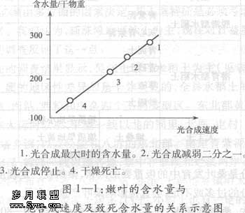 首先,桑树需要水,其一生中,叶片含水率约70—80%,枝条58—61%,根54—60%。树体各部分的水分主要依靠根部从土壤中吸收而来,如果土壤供水不足,便将影响桑树健康地生长发育直至干枯死亡。当土壤对桑树的供水不足时,首先是矿物质的供应受到限制,叶片内进行的光合作用削弱甚至停止,原生质由溶液态变为凝固态,粘性增大,生命活动显著削弱,失去对高温的调节能力,最后导致死亡。从图1—1中可以看出,正常发育的桑叶,其含水量对干物重的比约为230—350%,此间光合成速度的下降对于含水量的下降呈迅速递增的态势,当含水率从原来的290%降低到280%时,光合成速度就下降了一半,降至220%时,光合作用就完全停止了,如再降至120—150%,叶片就将因干燥而死。可见在叶片干燥死亡很久以前,水分已成为抑制光合作用的主要因素,光合作用早已停止。