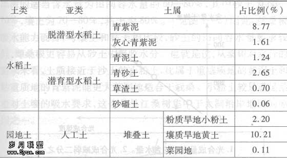 现在的调查结果显示,吴江土壤以水稻土为主(见表1—2)。但是其土属的地区性差异却是十分明显的,全县水稻土的大体分布为北壤、南粘、西粉和中杂四个不同类型区。东北部黄泥土,主要分布在大运河以东、平望一线以北的同里、北厍、屯村、金家坝、芦墟、莘塔乡镇,以及松陵和八坼的东北部。南岸青紫泥土,主要分布于盛泽、震泽一线以南各地,集中在麻溪和烂溪两岸。西部小粉土,主要分布在松陵、八坼、横扇、庙港、七都等乡镇沿太湖一带。中部以黄泥土、灰底黄泥土居多,白土、小粉土也有一定的比例,主要分布在八坼以南、运河以西和盛泽、震泽一线以北地区。从表中我们可以看出,包括小粉土、白土在内的轻壤土约占全县土壤的25%,它们主要分布在太湖沿岸、运河以西地区。