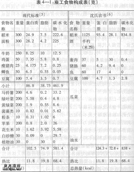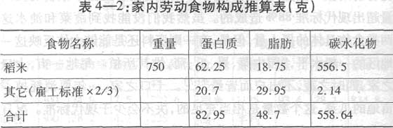 自行耕种即家内劳动,前面说过,家内劳动,则单位劳动力每天口粮至多不过一升,为雇工的三分之二。我们把粮食的这一比例扩大到伙食的其它部类,便可推算出一份家内劳动的食物构成表(见表4—2)。将推算出来的数据与表一“现代标准”一栏中的可比部类相比较,即可看出,除了蛋白质一项大致相当外,脂肪和碳水化合物两项仍以较大的幅度超过现代标准。可以断言,即使考虑到无法比较的瓜菜和植物油这两类食物,家内劳动食物供给的营养标准不会低于现代标准,至少其中热量的供给决不会低于现代标准。换句话说,按照现代人体生理营养标准,《沈氏农书》提出的家内农业劳动的食物供给量已完全能够满足人体的生理需要,相对于雇工的供给量而言则更为合理。