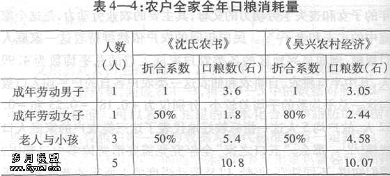 现在,我们可以根据家庭中单个劳动力的这一食物标准推算整个家庭的食物需求,从而回答本节所提出的问题。在对一般农户全年口粮需求总量进行推算之前,我们还需了解农户家庭人口规模的一般水平。从明清江南的情况来看,“五口之家”是一个普通的小农家庭比较常见的人口规模,其中包括一对夫妇及其未成年的子女和丧失了劳动力的父母,其主要的农业劳动力,是这个家庭中的丈夫和妻子[9]。民国年问的农户依然维持着这一家庭人口规模,例如吴兴地区的各类农户家庭人口的总平均数为4.99人,其中半自耕农、自耕农和佃农这三类农户各自的户平均人口数与这一总平均数的平均差较小,分别仅为+0.18、-0.23和-0.52人,故户均5人这一指标较好地代表了这三类农户的家庭人口规模[10]。那么,“五口之家”全年究竟需要消费掉多少口粮呢?我们知道,不同性别、年龄、以及劳动强度的人所需的营养和消耗的热能是不同的。若以一个从事农业劳动的成年男子消耗的粮食作为一个基本单位,将女子以及基本不从事劳动的未成年人和老年人,均折合成基本单位,其总和便是“五口之家”全年的口粮数额。从事农业劳动的成年男子的口粮,按照沈氏的标准是3.6石,按照刘大钧的调查是3.05石;二者对其它人员折合所采用的比例也不一样,沈氏在制定雇工供给规则时,提出了“妇人半之”的原则,这实际就是一个男女折合比例[11]。刘氏认为“吾人对等成年男子之,除成年男子作为一个,女子作80%外,儿童作为50%”[12],是较为常见的折合比例。我们不妨以各自的标准口粮与折合比例计算各自的结果,见表4—4。由于两者均未给出丧失劳动能力的老年男女的折合比例,考虑到沈氏所定的标准口粮较高,而刘氏所定的女子折合比例较高,结合现代50%左右的标准折合系数,我们将其定为等同于儿童的折合比例,即50%;另外,沈氏没有给出儿童的折合比例,考虑其标准口粮额较高,将它定为50%不会有太大的缺口。从表中“合计”一行的数据可以看出,两个计算结果竟然十分接近,因此,可以确信,一般农户全年口粮消耗为10~11石。