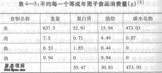 营养标准是根据不同人的营养生理需要量而制定的营养供给量,这一营养生理需要量是能保持人体健康状态,达到应有发育水平,并能充分发挥效率地完成各项生活和劳动等活动的人体所需要的热能和营养素的必要量。我们不妨用人的营养标准来衡量《沈氏农书》中提出的口粮标准,见表4—1。