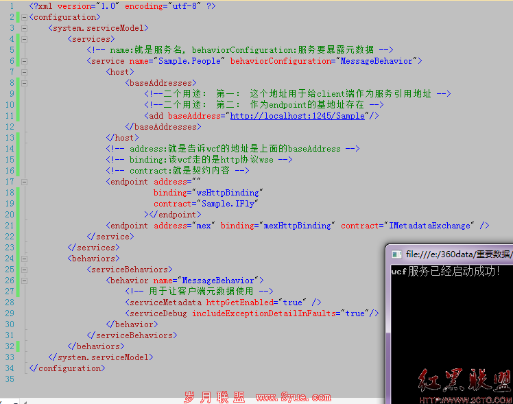 第三步:现在服务处于预开启状态,为了让wcf更加灵活,更加容易控制,就要将相关配置写入到config里面。