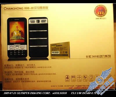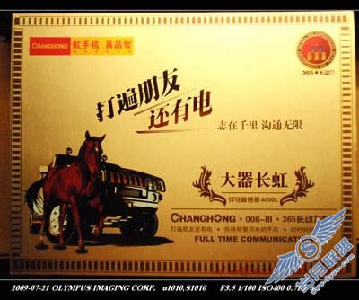 买了PHILIPS 9@9K后,受骨头前辈的“毒害”,开始留意008了,2009-7,9K开始出现疲态,7月20日立马就到长虹代理出拿了一台008,去前电话联系好了说是4K电池的008悍马VI尊贵型(过程说了超过10分钟,基本才搞清楚),到了一看却是全金色包装,更没看见那个台湾大奶妹印在包装上了,连那台米国吉普车也用一匹马遮住了大半(如果四川企业跨国收购成功估计以后那吉普车也会没有了的),打开一看还好机器不是全金色,装机一试有蓝牙、有录音、电池是4K的,开机时那大奶妹的声音也换成了大陆男中音了,仔细看印的是长虹365长动力系列 008-III汗马尊贵版不是我要的VI尊贵型,代理说目前只有这款,比VI的还新款,想想反正功能上能满足我也就无所谓了,接着打个电话,同事说清晰度不错,当下就交钱走人。