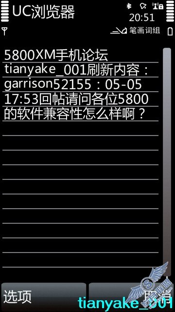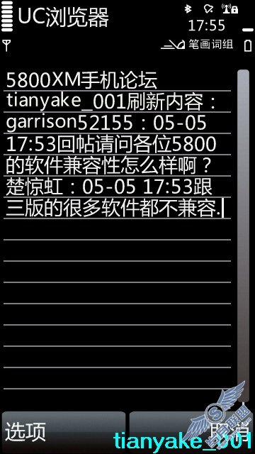 由于5800是智能机,使用uc想复制粘贴文本时,没有直板健盘手机方便,但复制粘贴这个基本的功能实在是好用,特别是在论坛发帖的时候,经摸索,现在找到了一个可以在uc任意复制粘贴文本的方法,虽然比直板机多了几个步骤,但总算是可以任意复制粘贴文本了。