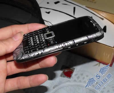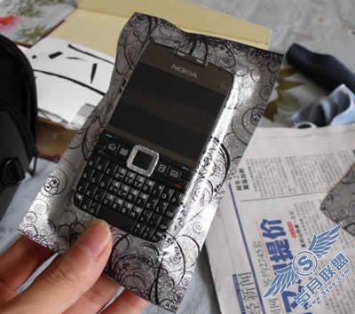 先将贴纸简单处理,贴在E71金属外壳上,慢慢的处理好边缘