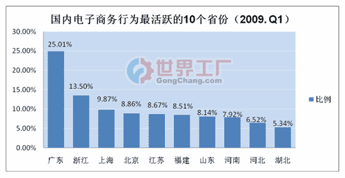 根据第1季度的访问监测统计,数据显示出2009年第1季度国内有过电子商务行为前十大省份。