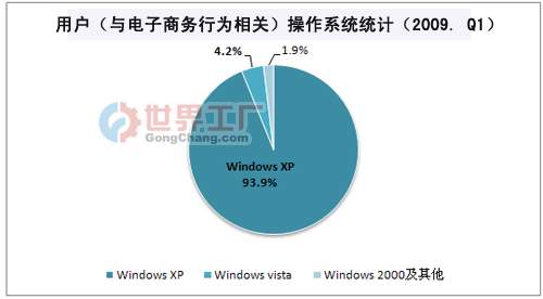 根据第1季度的访问监测统计,中国与电子商务行为相关的用户操作系统中,Windows XP的使用率最高,比例为93.9%,占有绝对优势,而使用Windows vista 、Windows 2000等操作系统的用户相对较少。