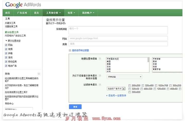 业务上需要的搜索项过多,而选项全部罗列会导致搜索模块过于庞大时,可以类似Google Adwords采用点击激活浮层来进行单项设置,用户在操作时也相对专注。收起检索条件模块,不让复杂的搜索条件干扰用户对结果列表的阅读。甚至可以基于业务特点为用户提供保存查询条件的个性化服务。