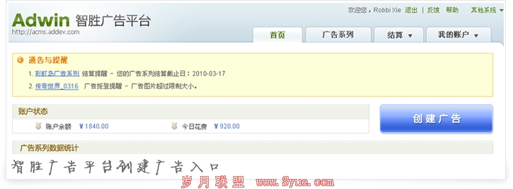 在智胜广告平台(AdWIN)的设计中,用户登录后便直接进入“个人首页”,在这里我们需要放置本平台最基础同时也是用户所有活动的出发点:创建广告。因此我们有理由在这个页面强调该入口,使它即能对新用户起到传达本平台的最大功能同时引导操作的作用,又能让老用户在登录之后直奔工作主题。