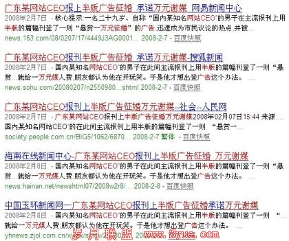 豪哥还不满足,他甚至通过“臭美显摆”的“万元谢媒征婚广告”极端方法宣传自己,结果广告中没有一个字提到他的网站,但最后好奇心促使诸多国内媒体千方百计地打听这个高调到脑子里进水的网站CEO是谁,最后大家都自然知道这就是豪哥的网站,而且印象深刻,这正是豪哥追求的推广效果。