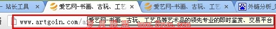 该站首页标题为“爱艺网-书画、古玩、工艺品等艺术品的领先专业的即时鉴赏、交易平台”,这样写有利有弊,利的方面是网站标题为营销型,重点是打造品牌;弊的方面是关键词选取太泛泛,都是一些行业词,如书画、古玩、工艺品等词,关键词选择不够精准。