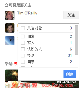 在google+里,想要关注别人并加入圈子时,只需将鼠标移动到“关注”按钮上,再点击一下即可完成所有操作;如果需要创建新的圈子,也只需在同一个浮层完成,整个操作体验很流畅。用户视觉关注和操作都在一个很小的区域内完成。