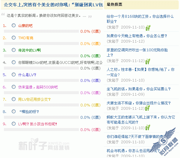 投票功能是SNS社区中的一点新的亮点,五花八门的投票可以让网友产生极高的兴趣,特别是您的好友如果超过5000的话,那投票可以说是引爆SNS营销最有效的方法之一,因为它集娱乐,评论,夸张等手法为一体!