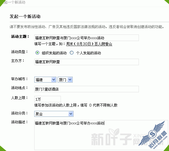 如果您的公司有举办活动的话,您可以在这里发布相关的活动介绍,并邀请您的好友来参加,线下营销是一种粘度较高的营销方式,依托SNS这个活动载体,您的营销会更加如鱼得水,虽然不一定全部的人都会参加,但是至少关注的人都是有兴趣的!