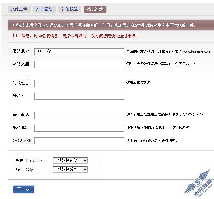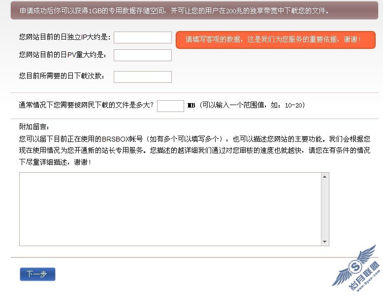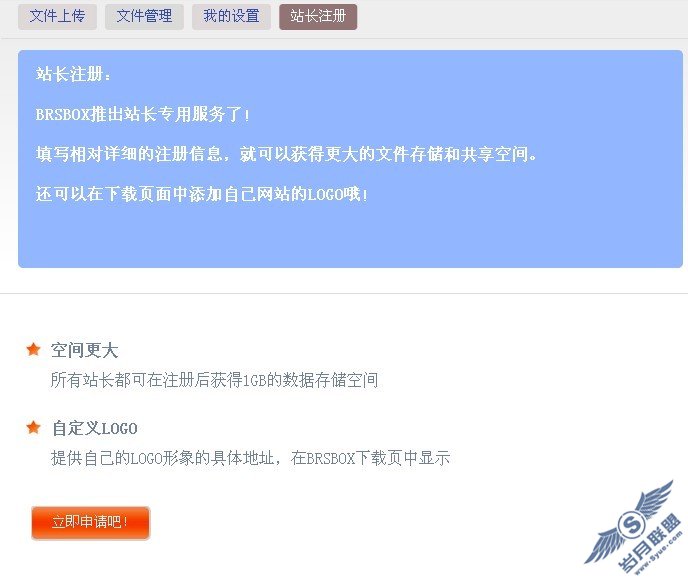 近日,站长网admin5.com编辑了解到国内知名的网络硬盘BRSBOX推出了一项与站长合作的新服务。个人站长通过点击BRSBOX首页上的站长合作申请链接,填写相对详细的注册信息,就可以获得比普通用户更大的文件存储和共享空间,还可以在下载页面中添加自己网站的logo,提供自己的LOGO形象的具体地址,在BRSBOX下载页中显示。申请成功后,站长可以获得1GB的专用数据存储空间,并可以让您的用户在200兆的独享宽带中下载您的文件。此项业务的推出,无疑给站长提供了一条新的免费推广之路。