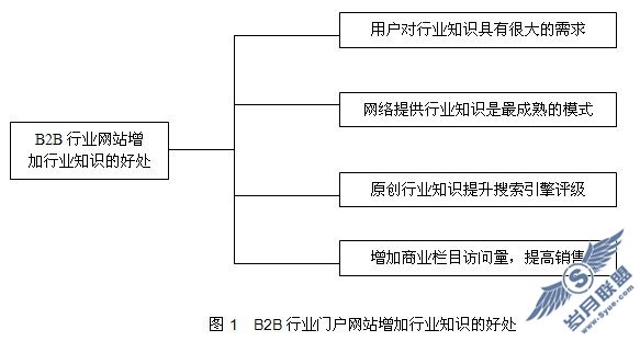 上面这段实际表明:做行业知识栏目最终的目的还是为了商业服务,企业成为收费会员,做了广告,无非就是想获得买家,而提供个人学习、工作的服务,最终的目的还是为了能够为客户提供来自各个渠道的买家。在一个企业里,一切都是围绕业务来转的,但是必须明白,在大部分的企业里,关心技术、市场、管理的人会大于只关注销售的人。一个企业要发展壮大,技术、市场可以说是最关键的两个环节,从业人数也是最多的、最核心的。B2B行业网站提供了行业知识、技术、行情、管理、市场等知识,有不懂的问题,都可以到行业门户去学习、去提问、去交朋友,我们就满足了企业里员工的这个需求,而这个需求的量是行业企业数量的10倍甚至50倍以上,解决这些用户的需求,也是B2B行业门户网站与阿里巴巴、B2B大行业网站最大的差异,也是核心竞争力。