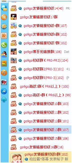 截止到今天go9go已经有16个初级链接群(PR0-PR3的网站),10个中级链接群(PR4-RR5的网站,4个高级群(PR6网站)1个顶级群(PR7以上的网站)另外还有3个按网站类型建的群,分别是go9go汽车链接群,go9go博百优链接群,go9go旅游链接群。一共34个链接群。其中有5个是500人超级群,其余的都是200人高级群。按现在的发展速度,不到一周的时间,1个200人的新群就能加满。