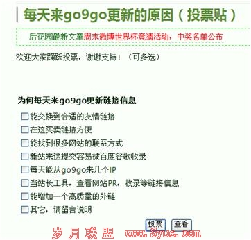 另外我还在自己博客发起过一个“每天来go9go更新的原因”的投票贴,其实醉翁之意不在投票,而是通过投票让用户了解go9go的一些功能特点。从而更加的愿意经常访问使用go9go链接平台。最终这个帖子有600多人进行了投票,3000多人浏览,169个人进行了评论,取得不了错的反响。
