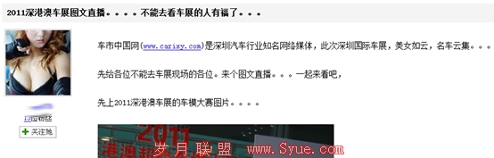 百度贴吧一向是很多推广人员的热门聚集地,除了一定的人流量之外,另外一个重要考虑的因素就是百度自己的权重高,外链效果好。但是现在的百度推广不太好做,发个赤裸裸的广告,百度管理员直接把你K了,发得隐晦一点,留不下链接。最近公司搞车展,于是我我尝试了一把,利用2011深圳国际车展的机会,在百度贴吧里做了一次实际的推广实战,端午节过后,于是把这个实际操作的过程和大家一起来分享: