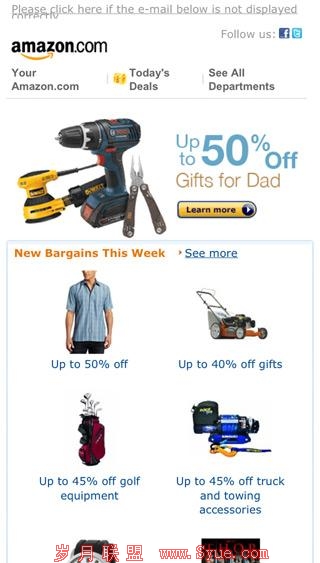 父亲节即将来临,很多在线商店都向消费者发送了节日促销邮件。下图是来自亚马逊的促销邮件,它符合了方便手机阅读的两个要素:产品列表为瘦长型,480px的宽度适合手机屏幕尺寸;白色底更好地凸显了产品图片以及文字和链接,让人一目了然。