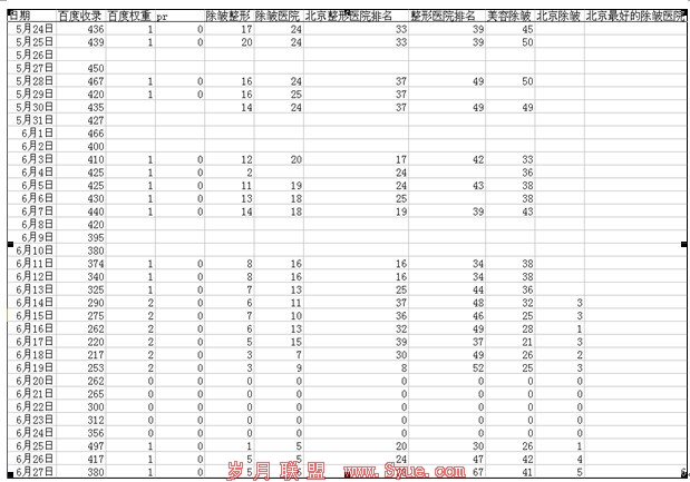 此图不是什么权重及关键词软件,是普通的excel,上面的信息是我每天收工进行记录的,作为一名网站的运营人员,记录你的网站的数据要坚持不懈。每天的工作虽然就是几个数字,但是长久之后便可以成为你分析网站问题的关键。通过数据的对比能够很清晰的反馈出是哪方面出现了问题。
