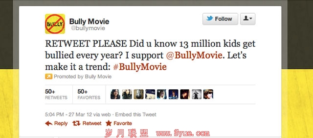 如果你想分享一部很有社会意义的电影却被电影局拒绝了怎么办?Bully就是一部以童年欺凌为题材的电影,在它5月30号上映之前,因为过于直白的台词被美国电影协会定义为R级。因为被禁,发行者Hirsch无法让它到达青少年的眼前,所以不得不转战社交媒体Tweet。 5月27号那天Hirsch发了一条Tweet:每年美国有1300万孩子会被欺负,300万孩子会因为被欺负而退学,我支持@Bully Movie,让我们用实际行动支持吧! 结果当天这条Tweeter被转发100多万次,人们纷纷点击在@Bully Movie私人空间里观看了这部电影。