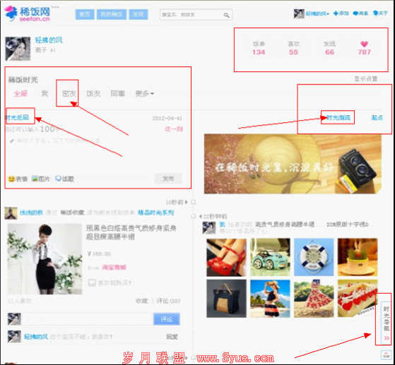 而且就上图所示,可以看出稀饭网非常重视社交与分享,而且现代的人对自己秘密的安全性是很重视的,所以时光轴在这一个点子上就抓住了用户心理,在这 个功能设计上,我们可以看到图中的好友里有一个密友的版块,有了这个特定的功能,用户就可以很随意的自由设置哪些生活记录给哪些人,哪些生活记录不给哪些 人看了,这样用户就完全可以放心的分享自己的生活记录,时光轴给人一种安心,放心的感觉。