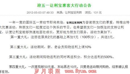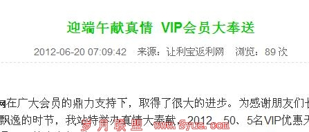 这一点是我今天的重点,也是针对淘客网站提出的。有的朋友说了,不仅仅是百度如此,其他的搜索也不好伺候,那好,以后我们就不伺候了。我们怎么办呢?我们要依靠人力资源,依靠我们的客户,我们的会员。其实你要是有心,你可能已经发现,即使百度收录好,有流量,很多也是过眼云烟,换位思考,我们也不会去一个陌生的地方就立马掏钱购物,因此,百度来的流量往往是没有转化率的。有转化率的还是老会员,会员介绍过来的朋友居多,鉴于此,明白的站长可能已经明白了,我们的出路就在于人力资源、在于老客户、老会员,我们的任务不单单是如何牢牢抓住这部分人,最主要的是还要靠他们的嘴去给我们宣传,去给我们推广。那么我们该如何做呢?我觉得你应该根据自己的情况,搞一些活动,不要玩虚的,因为大多数人都是无利不起早的,你不给人家好处,人家凭什么替你说好话,给你宣传。宣传初期我们要本着赔钱赚吆喝,赔本赚人气的思想。大家可以看看让利宝返利网,百度几乎没有排名,更没有来自百度的流量,可是让利宝返利网依然是红红火火,人气旺盛,收益很好,这既源于他的活动推广。大家可以看看它的推广文章,希望能从中得到一些启迪,如下图所示。