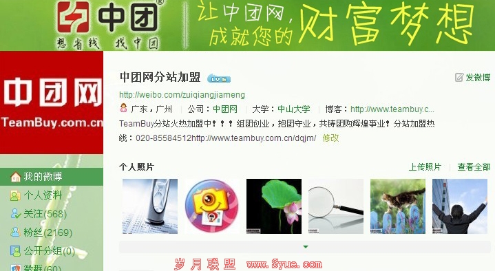 2、要将微博的用户实实在在的转移到自己的网站。如下图中是中团网分站加盟的微博,在账号信息内的博客,实际是上链接到http://www.teambuy.com.cn/dqjm/的加盟页面。