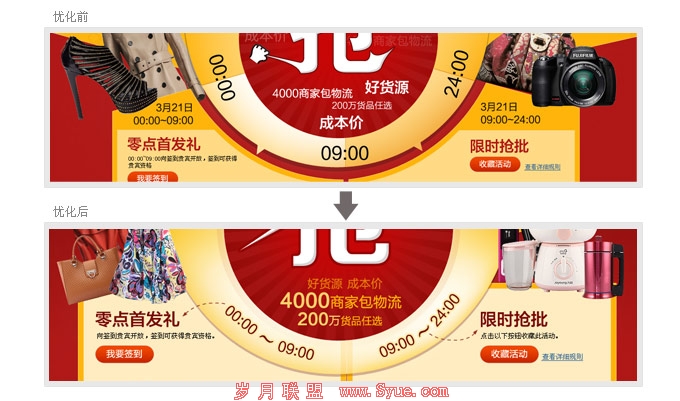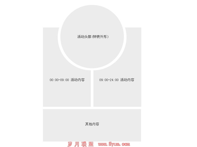 首先通过分析需求方案,可以发现整个活动都是围绕时间进行的,分为“00:00-09:00”、“00:00-09:00”两个时间段;于是联想到可以通过时间(或时钟)概念来对页面进行布局;