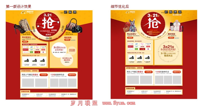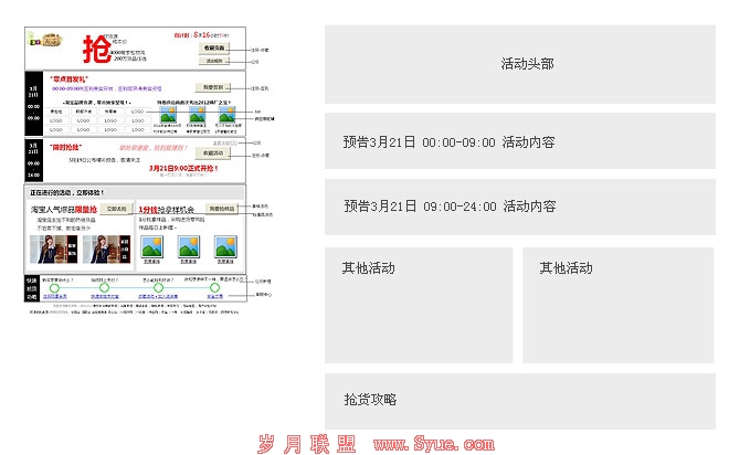 众所周知这是设计的第一步,个人认为这也是最重要的一步;因为整个活动的风格走向都是在这一步确定的。首先需要弄清楚需求方想要什么,可能这个需求方不止一个人,关键是谁来做决定;通过直接或间接的方式收集到的关键词是“热闹”、“抢”;因为是为3月21日的促销做预热,所以整个预热页面的重点就是促销气氛的烘托,以及3月21日当天活动告知。下面左侧为321预热页面需求草图,概括如下(右侧):