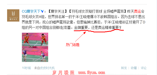 上图中我们看到的是今天凌晨刚刚发生的一个新闻事件,中国和韩国为了各自的利益打假球事件。借助这一事件我们可以引发出对于金牌重要,还是奥运精神重要?这一话题的讨论。这将可以很好的调用粉丝的积极性。借助当前的时事热点引发粉丝的讨论,进而积聚自身的人气,同时提升企业的品牌认知度。相较于上文提到的两种模式,这种模式的效果存活时间更加的长,别且可以获得更多的死忠的目标粉丝,甚至可能是一些我们的潜在客户。但是其也存在着不足,那就是实施的难度更大,寻找到一个既能一起粉丝关注又能提升企业品牌认知度的时事热点还是比较难的。