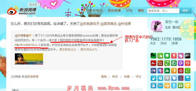 上图我们看到的就是一条借助奥运热门人物菲尔普斯来营销自己产品的微博。就如我们常见的电视节目中安插广告那样,我们也可以巧妙的在我们的微博信息中安插适当的广告。有的人可能会说,一条微博也就只有140个字左右,怎么够安插广告,其实我们安插广告并不需要只是局限在文字上,我们可以借助视频、图片等形式的广告内容。借助一张能够吸引粉丝注意力的图片抵得上你的千言万语。当然这种模式也存在着一定的局限性,那就是我们在安插广告时候需要有一定的创新,同时也要能够把握好度,过度或者明显的广告容易引起粉丝的反感,反而会带来反效果。