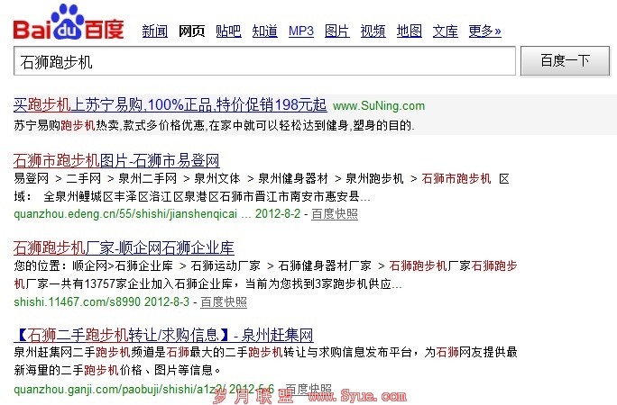 我们打开alexa网站排名,可以发现像赶集网、58同城网、口碑网、大众点评网等排名都非常不错,这也意味着这些网站流量都是十分巨大的,对于SEO来说是免费外链的重要渠道,对于SEM来说是抢占搜索引擎的主要手段,比如泉州跑步机、石狮跑步机、晋江健身器材等,你可以发现搜索结果前几页基本上是各大分类网站的信息排名。如图: