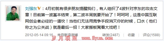 这样一场高调的战役从5月14日的一条微博开始,刘强东写道,“4月初就有很多朋友提醒我们,有人组织了4波针对京东的攻击文章!目前第一波基本结束,第二波本周就要开始了!这是中国互联网创业者必经的一道坎!当他们无法用竞争手段消灭你的时候,口水(他们称之为公关战)就是最后一招!大家搬板凳看大戏吧!”