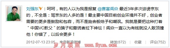 而在今年6月京东被曝光2011年业绩只有212亿元,比刘强东一直强调的309亿元少了近100亿元,也让陈年暗讽了一把,陈年说,“半年前在副市长亲自主持的会上,我听到某人说其公司2011年如何,我也曾信以为真!但最近,我才知道,居然可以多吹100亿。我最近为此反思自己了。”