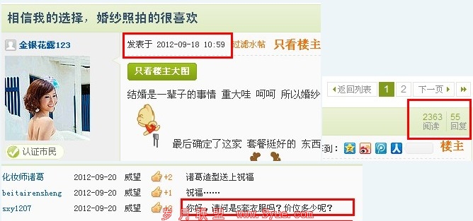 今天是21号,可以在图中看到,这份帖子经过推荐,然后仅仅放在内页板块之中就得到了如此多的宣传,而且一个小小的宣传就可以让其他人觉得漂亮从而让楼主发送服装的地址和价格,不得不说靓图婚纱最美好的事情,从另一面也突出了,照片摄影就是实力的比拼,是进步的阶梯。