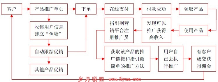 客户→产品单页(→收集用户信息建立“鱼塘”→自动跟踪促销)→下单→在线支付→付款成功→领取授权认证码→使用产品→发现还可以推广高利润赚钱→指引到营销平台注册推广员→获取该产品的推广链接和指引最简单的推广方法→用户自己就去推广了→客户来了以此循环。