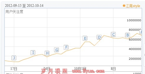 先来展示一下“江南style”的百度指数,看看这些庞大的搜索数字,你会感觉到什么才是疯狂,如下图
