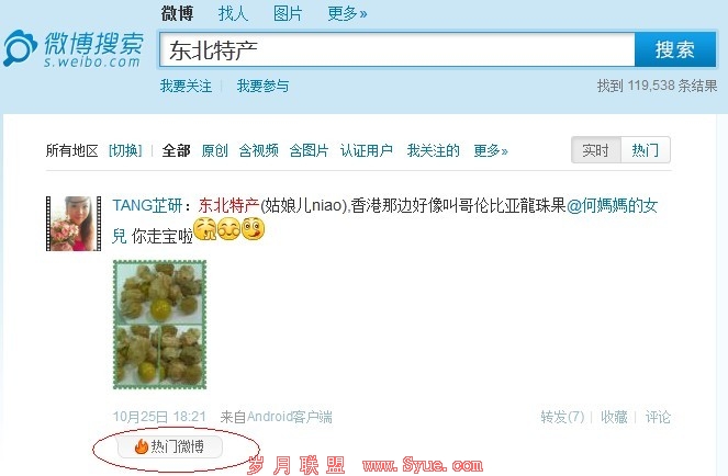 东北特产转发 “7” 就成为了热门微博,一般的词不是上榜了的或者特别热的那种词,10个以内的转发和评论都可以上热门微博。所以我们只需要找几个好友帮忙转发和评论就OK 了,但是请注意不要每个微博都找同样的人来转发和评论,这样下去迟早被屏蔽。一般这样之后最多2个小时就能上热门微博了。