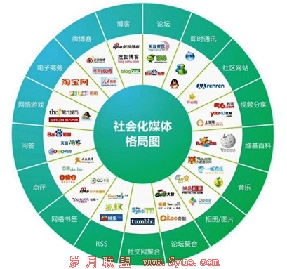 第四、不断扩展社会化媒体类型,不要只局限于一种类型的网站,要努力让自己无处不在。当然也不能过于分散精力,但是一定要在每种类型的网站上都拥有账户,要对这些网站的工作流程有个大概的了解,当需要分享一些有价值的信息时,就不会无所适从。我们国内的社会化媒体也发展到领域顶阶段,已经涵盖了很多领域,如下图