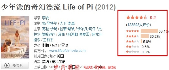 这是在百度top中看到的,《少年派的奇幻漂流》,这一步电影出来没有几天就让如此多的人获得了关注,不得不说影片无论是从质量上还是构思上都是很有韵味的,流量就是代表,而在豆瓣之中,早已经晋升为了关注榜的第二位置,更加说明了地位,而在豆瓣上的评分也是如此,如下图