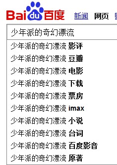 百度给予了我们太多太多的搜索建议,说实话,这一点却很少有人可以利用到,为什么呢,因为在百度之中营销仅仅是一段时间的吧,然后在以后就没有关注要点了,可是呢,如果你可以从里面一个点入手,获得关注,在百度之中也可以有很好的表现,就比如《少年派的奇幻漂流》,这部电影,如下图所示