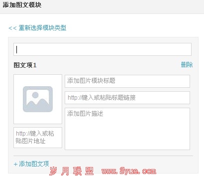 一个大图模块设置好了之后,开始第三步,继续添加图文模块,模块标题不用填,在左侧填上图片的地址,右边要链接的地址,以及相关的文字说明,比如公司简介等。一般的最好多添加几个图文项,同样的加上图片和相关的链接、文字说明。需要注意的是,在最后一个图文选项里面最好放上相关的联系方式、地址等,以及企业资质。