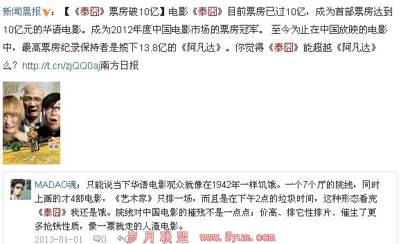 我身边看过《泰囧》这部电影的人对这部电影的评价也很一般,相对来说,更加喜欢之前票房较差的《人在囧途》。上面两幅图,是我在微博中截下的,大家对电影的喜好度不同这是很正常的现象,但是就我使用微博搜索的结果来看,似乎反应一般的人群占了大数,而反应趋于中性以及褒奖的人中,偏官方的媒体又占了很高的比例。
